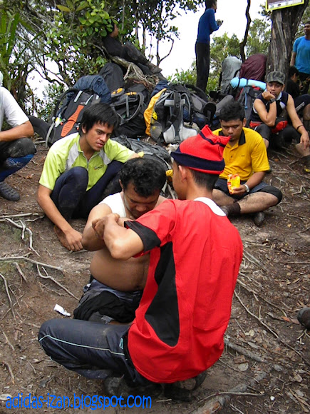 waktu inilah dan ketikanya... aku mendengar keluhan dari kengkawan... "zan ada lagi ker.. bila nak habis ni... jauh lagi ke oii" aku gelak dulu waktu ni... sambil melihat puncak diatas dan tempat aku nak panjat... selamba je aku cakap "a'ah.. jauh lagi... lepas puncak tu ada lagi puncak... dalam 3 lagi..." hah ambik ko..! student aku dah gelak2.. saje aku kasi mental.. Lokman berkata dalam perlahan kepada ku "terbaik la, zan!" hahahaha... selamba jer aku sound " itulah... dari dok ofis, kena aircond, buat keje senang... korang gedik sangat nak ikut aku mai sini.. aku dah larang dan JANGAN IKUT tapi.. nak gak ikut..." hahahaah... abg mie, abg zamri dan abg art terkedu bila mendengar kata-kata ku... abg khamis tersenyum melihat ku... begitu jugak lokman yang dibelakang ku... aeman dan nizan tidak peduli kata-kataku...